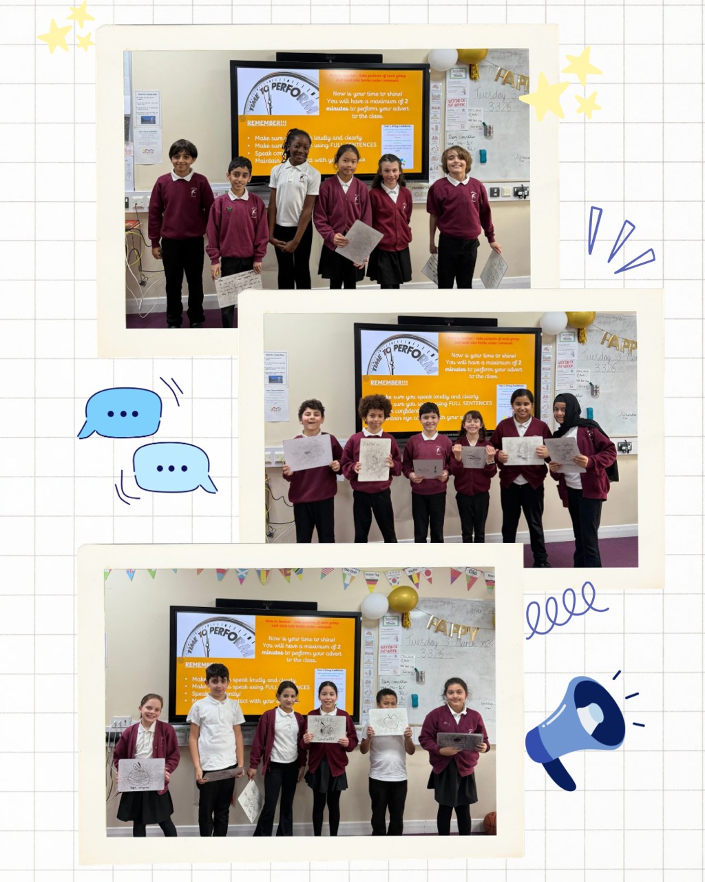 Year 5Year 5 used their oracy skills and the support of their oracy guidelines to perform their adverts in small groups.